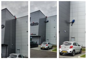 Here she comes – Ruth Ross abseils 60ft down the Aico building in Oswestry