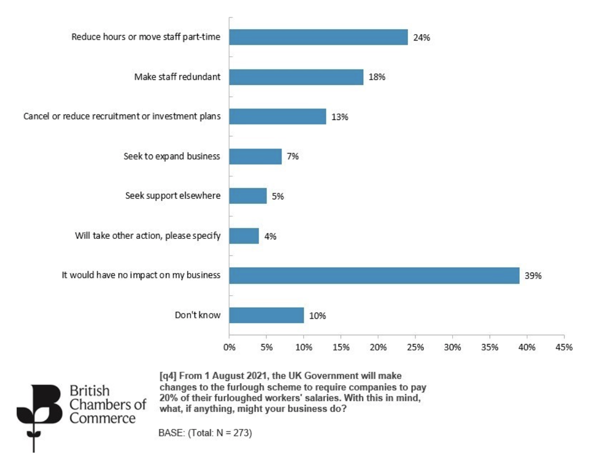 The survey, carried out by BCC, asked over 250 businesses with employees still on furlough what their response might be to employers' contributions to the scheme rising to 20% from August 1; nearly 1 in 5 (18%) said they would make staff redundant.