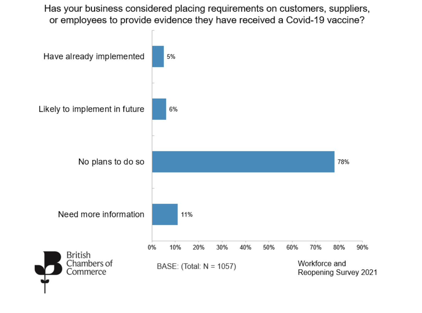 - A survey of more than 1,000 UK businesses carried out by the BCC shows that only 5% of firms have already implemented their own requirements for proof of vaccination