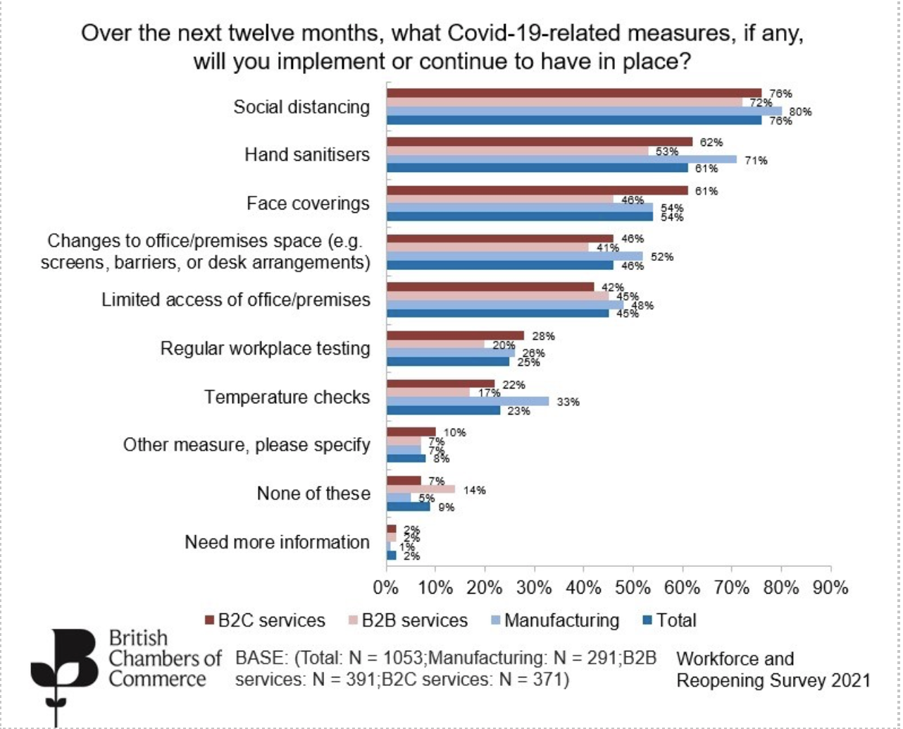 The data, from a survey of more than 1,000 businesses across a variety of sectors and based in all parts of the UK, also shows that social distancing and hand sanitising are the Covid-19 measures firms were most likely to expect to continue to have in place over the next 12 months.